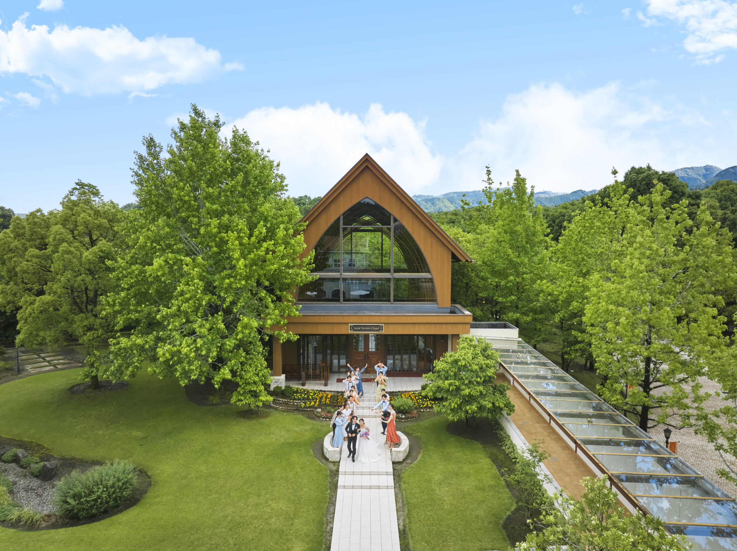 約3,300坪の広大な敷地に広がる、静寂と緑に包まれた自然豊かなロケーションに佇む結婚式場は、