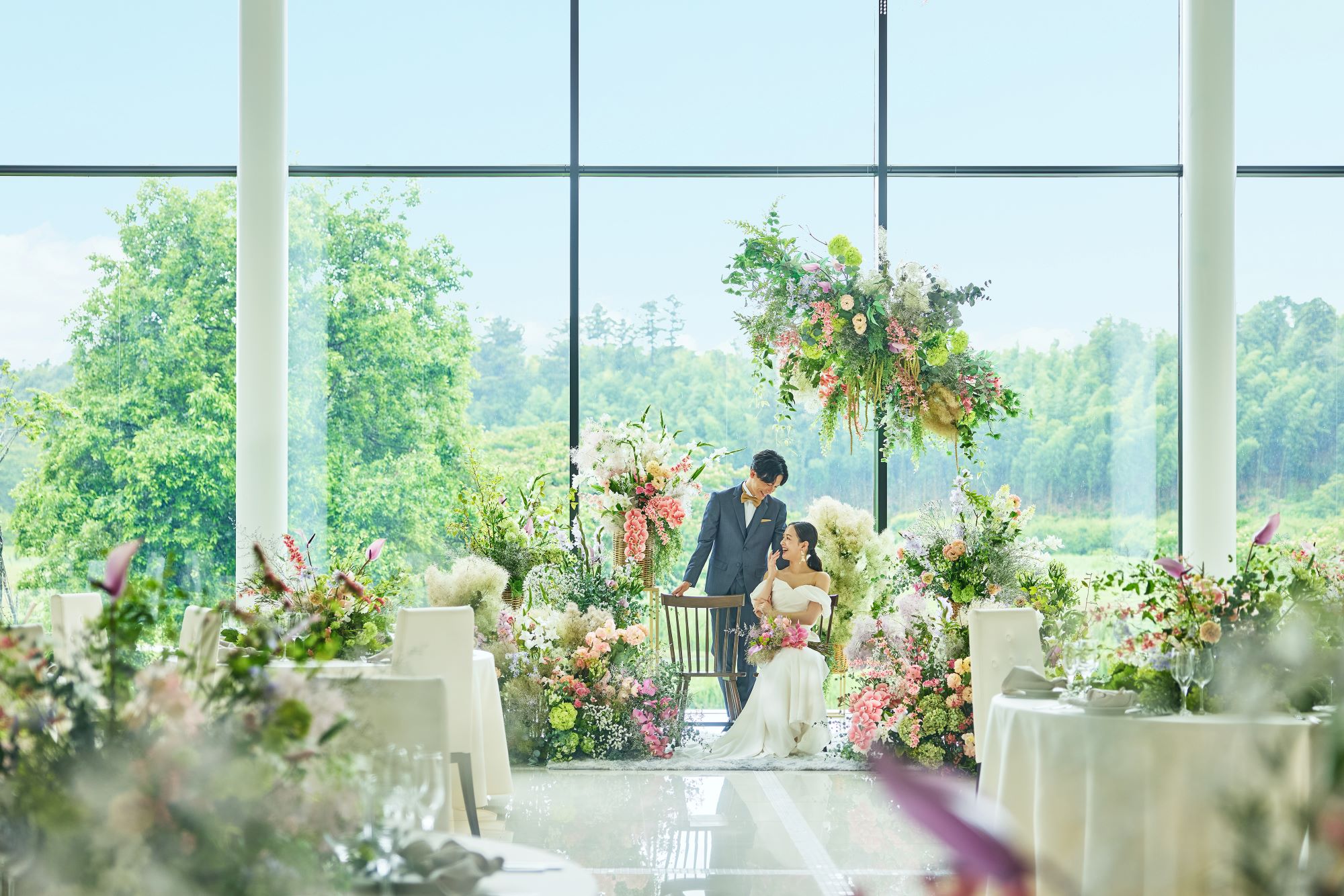 三面ガラスの披露宴会場からは、季節によって表情を変える庭園が一望でき、